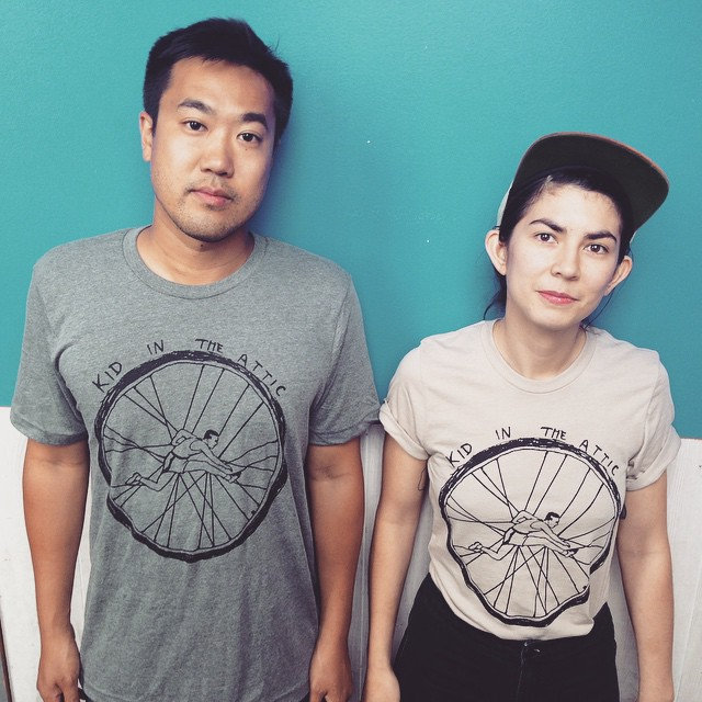 Custom designed Kid in the Attic Spoke Hurdler Shirt, available in heather tan and dark heather grey.